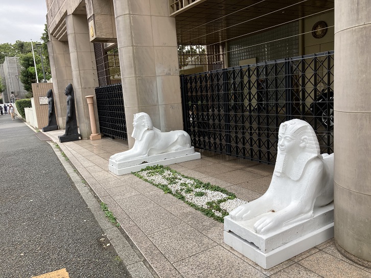 旧山手通りにはお洒落な結婚式場とか高級レストランとか有名ブランドのお店とかが軒を連ねていますが、その中にエジプト大使館も旧山手通りに面しています。大使館にはそれぞれのお国のアイデンティティが置かれていますが、エジプト大使館の正門前には古代エジプトの彫像が守衛の役目を果たしています。これがミイラだったら訪れる人はいないでしょう。
