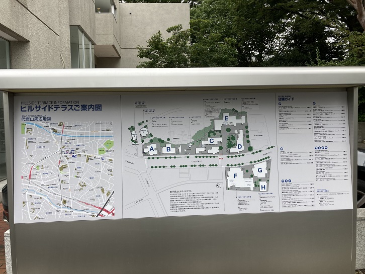 旧山手通りの一角にヒルサイドテラスの案内板が立っています。ヒルサイド(hillside)とは、「山腹」とか「丘陵の斜面」の意味ですが、確かにこの辺りは旧山手通りの高台から目K川に向って崖のように斜面が続いていますね。別の案内碑にその歴史が説明されています。