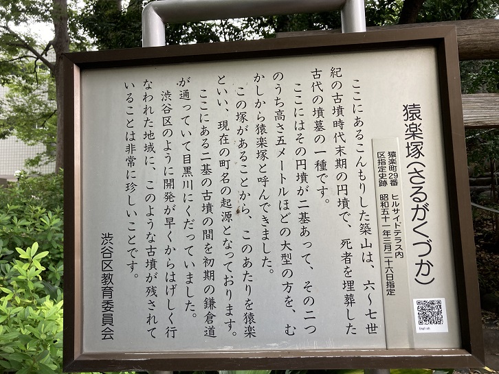 ここにあるこんもりした築山は、六〜七世紀の古墳時代末期の円墳で、死者を埋葬した古代の墳墓の一種です。ここにはその円墳が二基あって、その二つのうち高さ五メートルほどの大型の方を、むかしから猿楽塚と呼んできました。この塚があることから、このあたりを猿楽といい、現在の町名の起源となっております。ここにある二基の古墳の間を初期の鎌倉道