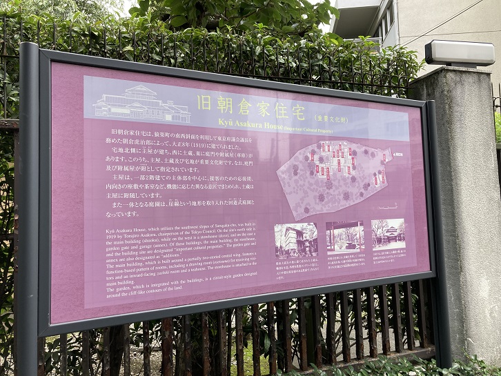 デンマーク大使館の隣りに旧朝倉家住宅が残っています。現在は一般公開され、往時の栄華が偲ばれます。入口の横に旧朝倉家住宅の案内板が立っています。高台なので夕陽に沈む富士山の山容も拝めたことでしょう。