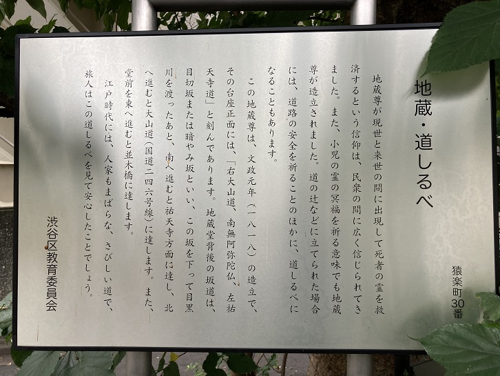 地蔵尊が現世と来世の間に出現して死者の霊を救済するという信仰は、民衆の間に広く信じられてきました。また、小児の霊の冥福を祈る意味でも地蔵尊が造立されました。道の辻などに建てられた場合には、道路の安全を祈ることのほかに、道しるべになることもあります。この地蔵尊は、文政元年(1818年)の造立で、その台座正面には、「右大山道、南無阿弥陀仏、左祐天寺道」と刻んであります。地蔵堂背後の坂道は、目切坂または暗やみ坂といい、この坂を下って目黒川を渡ったあと、南へ進むと祐天寺方面に達し、北へ進むと大山道(国道246号線)に達します。また、堂前を東へ進むと並木橋に達します。江戸時代には、人家もまばらな、さびしい道で、旅人はこの道しるべを見て安心したことでしょう。