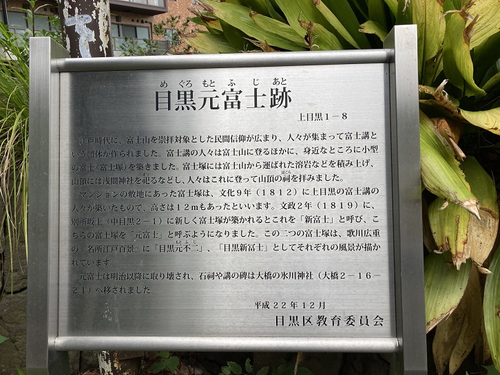 江戸時代に、富士山を崇拝対象とした民間信仰が広まり、人々が集まって富士講という団体が作られました。富士講の人々は富士山に登るほかに、身近なところに小型の富士(富士塚)を築きました。富士塚には富士山から運ばれた溶岩などを積み上げ、山頂には浅間神社を祀るなどし、人々はこれに登って山頂の祠を拝みました。マンションの敷地にあった富士塚は、文化九年(1812年)に上目黒の富士講の人々が築いたもので、高さは12mもあったといいます。文政二年(1819年)に、別所坂上(中目黒2−1)に新しく富士塚が築かれるとこれを「新富士」と呼び、こちらの富士塚を「元富士」と呼ぶようになりました。この二つの富士塚は、歌川広重の「名所江戸百景」に「目黒元不二」、「目黒新富士」としてそれぞれの風景が描かれています。元富士は明治以降に取り壊され、石祠や講の碑は大橋の氷川神社(大橋2−16−21)へ移されました。
