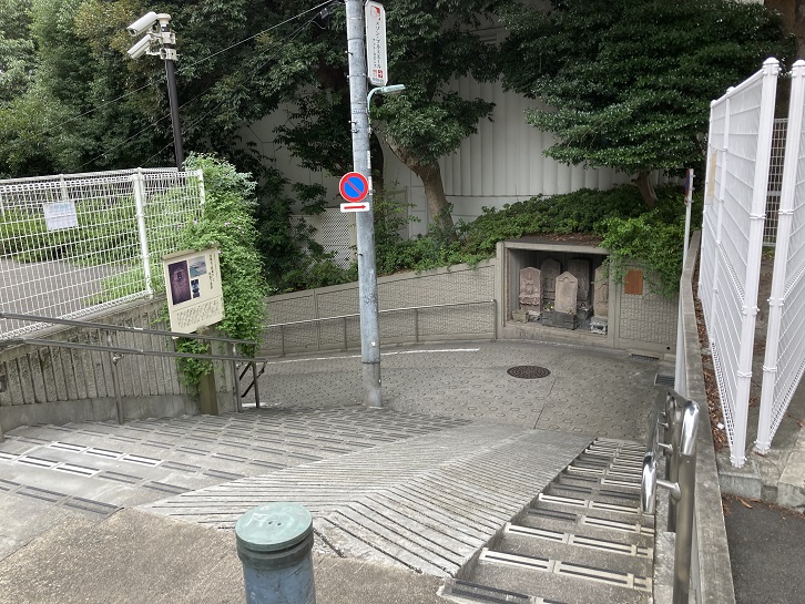 目黒川に下りる坂の入口に、見所ポイントFの「目黒元富士跡」の案内板が立っています。