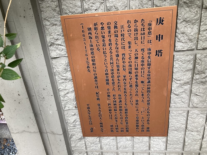 別所坂が直角に折れ曲がる角に庚申塔が祭られた小祠があり、その横に案内板のプレートが壁に貼り付けられています。