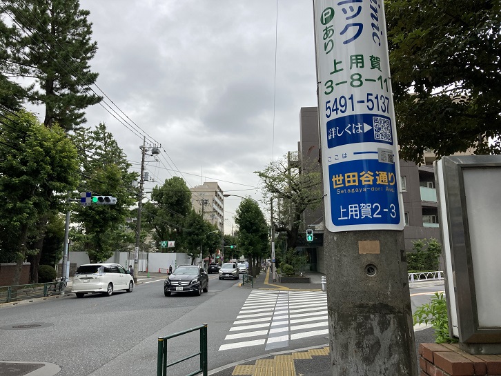 世田谷通りを進みます。世田谷通りは、国道246号線(玉川通り)の三軒茶屋交差点を起点とし、狛江市東和泉の神奈川県境に至る延長9kmの概ね往復2車線の都道です。世田谷区内では沿道に世田谷区役所や東京農業大学・NHK放送技術研究所・国立成育医療研究センター・日本大学商学部などがあり、狛江市内では小田急小田原線の喜多見駅・狛江駅・和泉多摩川駅の付近を通ります。世田谷通りは川崎市に入ると津久井道という通称に変わり、町田市に入ると鶴川街道という通称名になって、概ね小田急小田原線に併行しています。道路としての歴史は古く、甲州街道の裏街道として、また絹や川魚や川崎特産の禅寺丸柿や黒川炭などを江戸へ運搬するための生活や商業の道路として活用されてきました。元々制度的に作られた道路ではなく、正式に路線認定されたのは昭和三十年(1955年)のことでした。世田谷区の区間は1964年に開催された東京オリンピックに合わせて整備されました。都会的雰囲気と田舎の風景を併せ持った道路です。