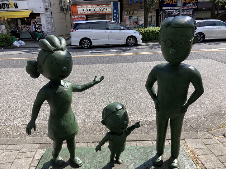「桜新町」の地名は、東京信託株式会社が明治四十五年から大正二年にかけて日本で初めて郊外に分譲住宅地「新町分譲地」を造成し、道路の両側にソメイヨシノを植えて桜並木にしたことに由来しています。玉川電車の停留所の名称は当初は「新町」としていましたが、後に「桜新町」と改称されました。国民的アニメ「サザエさん」の原作者である長谷川町子さんも亡くなるまでの40年の間桜新町に住んでいました。長谷川町子さんは自分が住む街の雰囲気をそのまま作品の中に投影していました。サザエさんに登場する磯野家御用達の酒屋「三河屋」は数年前まで実在していたのだそうです。駅からほど近い場所にある「桜町不動産」は、カツオくんの同級生である花沢さんの実家として描かれている「花沢不動産」のモデルとなりました。桜新町駅の前を通る都道427号線の桜新町交差点から南方向に延びる「サザエさん通り」を中心に、商店街の至るところでサザエさん一家がお出迎えしてくれます。桜新町駅西口の直ぐ先で、さっそく波平・フネ・カツオ君・ワカメちゃんがお出迎えしてくれます。