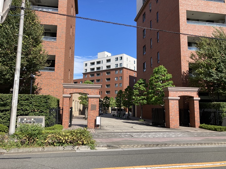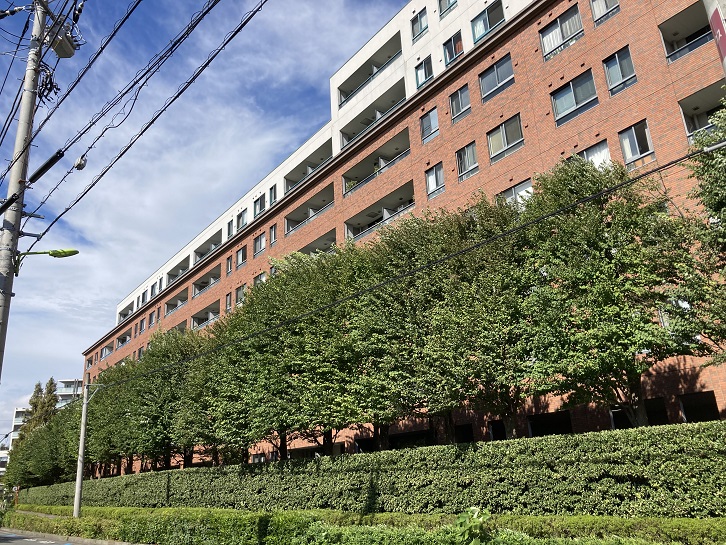 用賀駐屯地のはす向かいに巨大マンションが2棟並んでいます。敷地面積が約2万u超で、総戸数359戸のマンションです。ヨーロッパの都市住宅を思わせる外観は高級感溢れるレンガ調で構成されています。広大な敷地内には植栽や公園などに緑がふんだんに使われ、茶色と白に配色された建物の外観が周囲の緑と相まって、重厚で存在感のある佇まいを見せています。