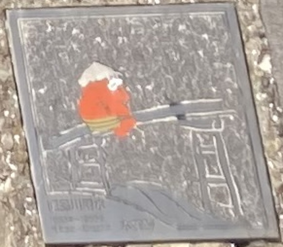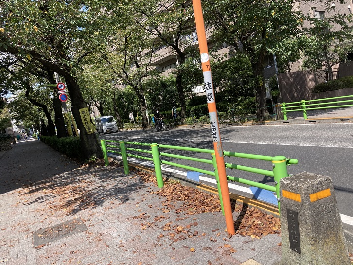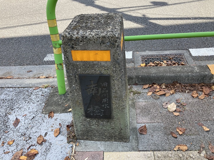 T字路の歩道に橋の親柱が向かい合っています。親柱にはプレートが貼ってあり、挿絵には「旧品川用水」と書いてあります。挿絵は傷みが激しくてよく見えませんが、水路に掛けられた橋の上を桶に乗った人が通っているように見えます。そんなことってあり???