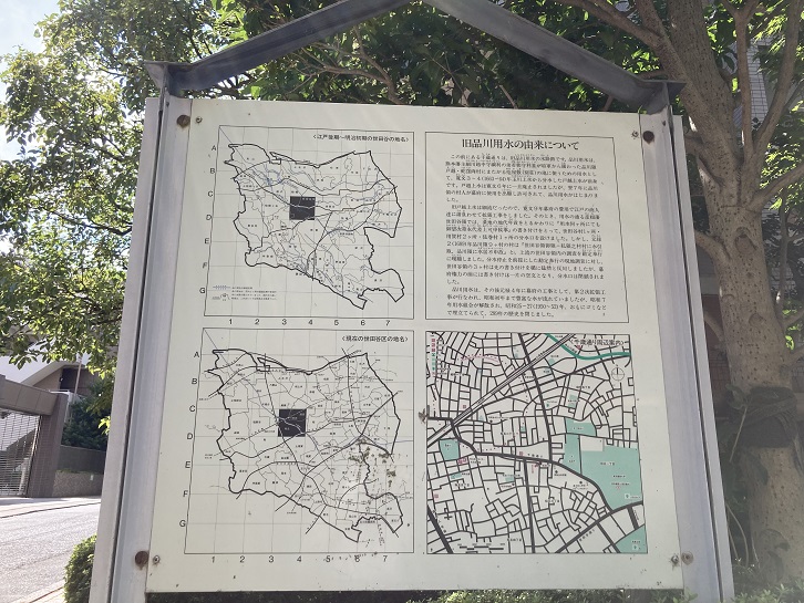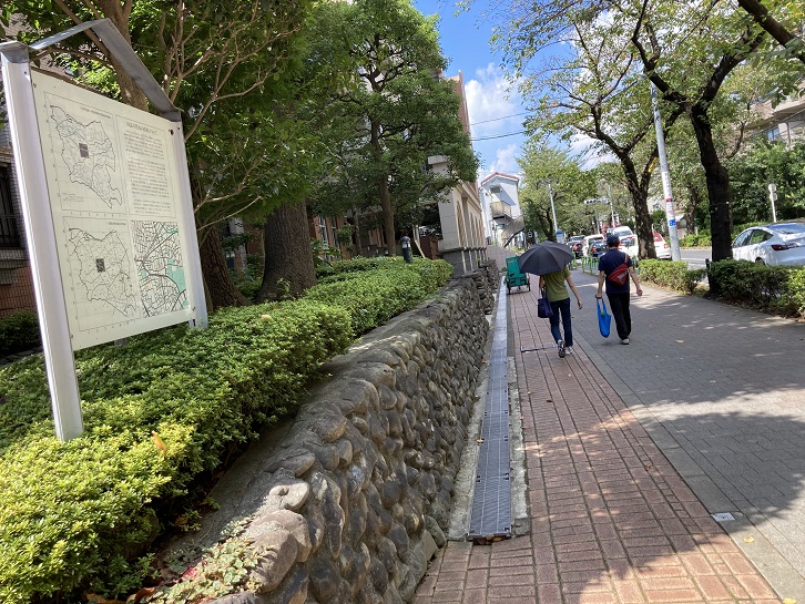 玉石垣の上の植え込みの中に品川用水の案内板が立っています。玉石垣は品川用水の石積み護岸をそのまま残した遺構だったんですね。