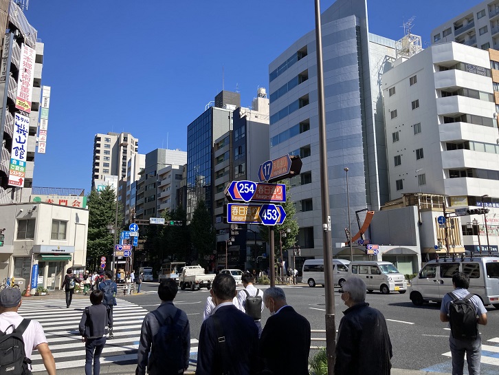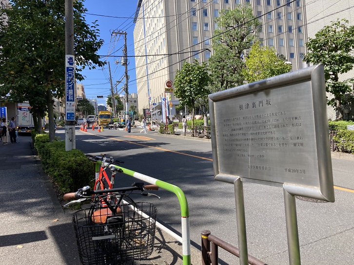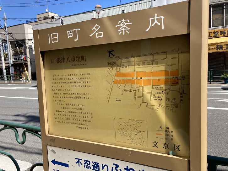 根津一丁目交差点で左折し、不忍通りに入ります。不忍通りと言問通りが交差する根津一丁目交差点周辺は、かって根津八重垣町と呼ばれていました。歩道脇に旧町名案内板が立っています。