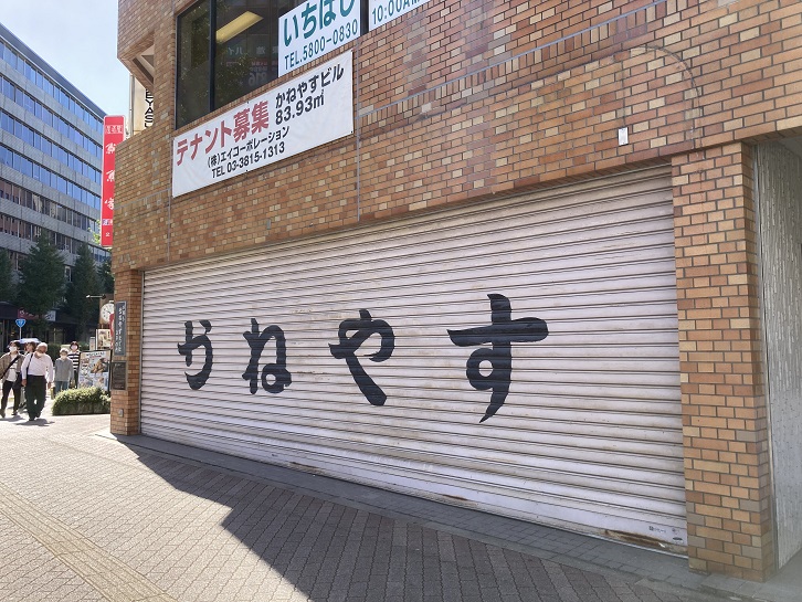 交差点の南西角に「かねやす」と大書きされたシャッターが見えます。近年まで洋品店として営業していたそうですが、数年前に店を畳んだようで今はシャッターを下ろしたままになっています。