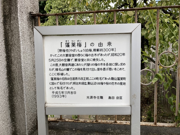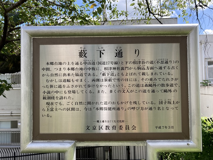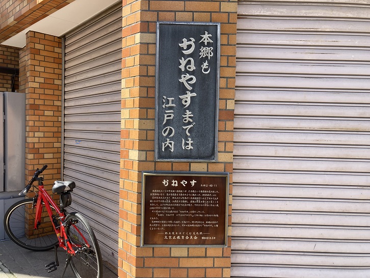 本郷弥生交差点で本郷通りを右折し、言問通りの弥生坂を下ります。2番目の信号の角の壁に旧町名の案内プレートが貼られています。