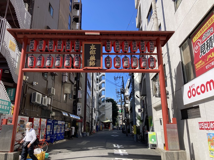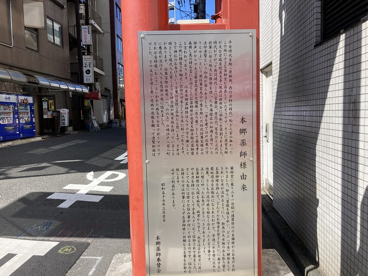 「かねやす」と春日通りを挟んだ反対側に本郷薬師の深紅の門(鳥居?)が建っています。