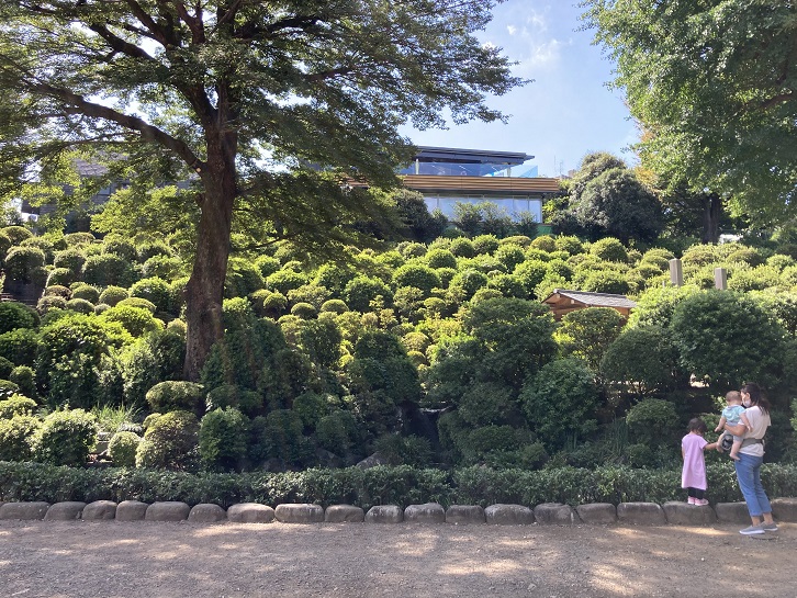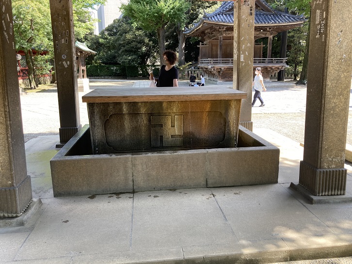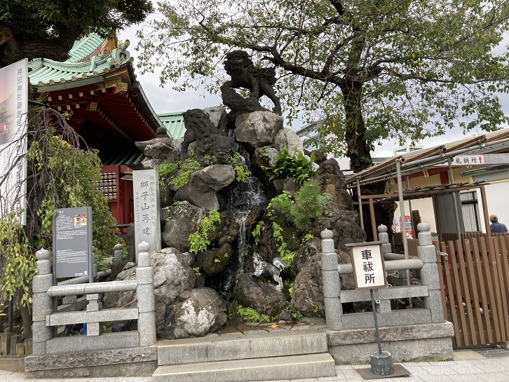 本殿の右手に「獅子山」があります。獅子山は親子の獅子像ですが、1923年の関東大震災の時に子供の獅子が失われました。1990年に新しく子供の獅子が作られ、現在の「獅子山」になっています。