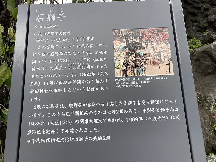 この石獅子は、区内に残る数少ない江戸期の石造物のひとつです。享保年間(1716年〜1735年)に、下野(現在の栃木県)の名工・石切藤兵衛が作ったものといわれています。文久二年(1862年)11月に両替屋仲間が石を積んで神田神社へ奉納したという記録があります。3頭の石獅子は、親獅子が谷底へ突き落した子獅子を見る構図になっています。このうち江戸期以来のものは夫婦2頭のみで、子獅子と獅子山は大正十二年(1923年)の関東大震災で失われ、平成元年(1989年)に天皇即位を記念して再建されました。