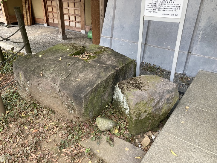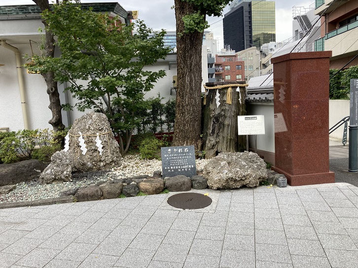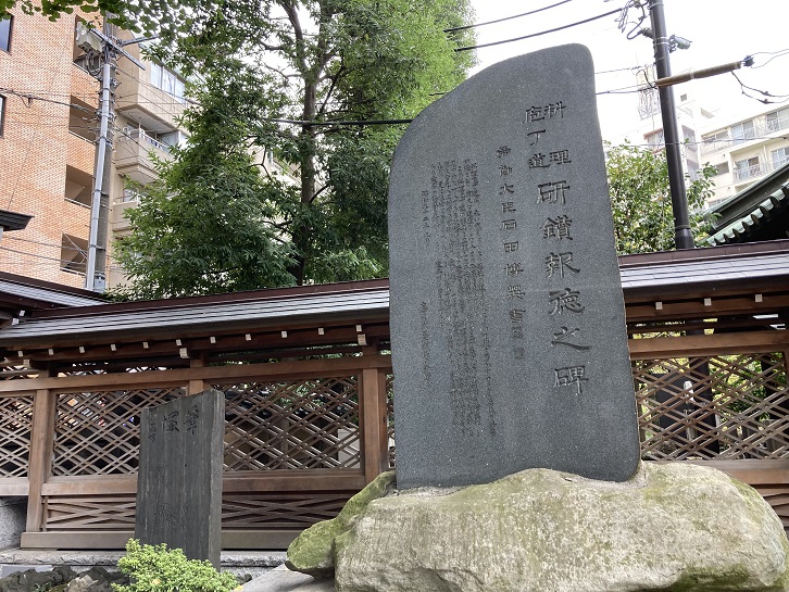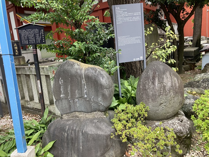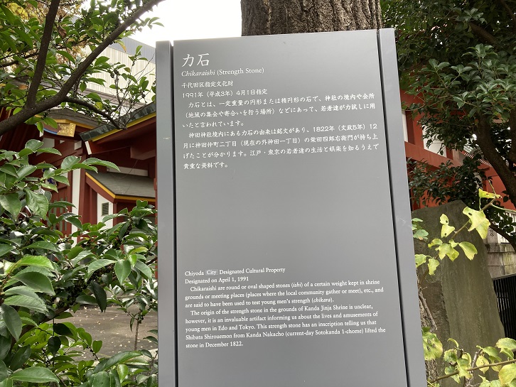Chikaraishi are round or oval shaped stones (ishi) of a certain weight kept in shrine grounds or meeting places (places where the local community gather or meet), etc., and are said to have been used to test young men's strength (chikara). The origin of the strength stone in the grounds of Kanda Jinja Shrine is unclear,