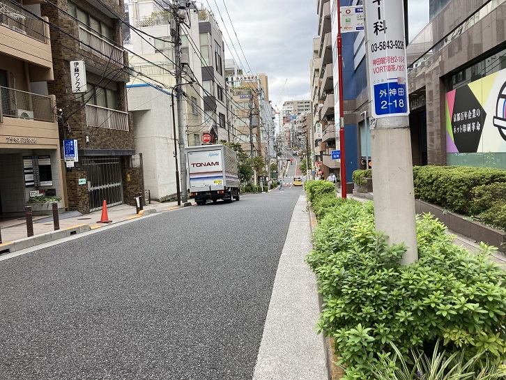 湯島聖堂前交差点を右折して湯島天神方向に進みます。道路の先が擂鉢の底のようになっています。