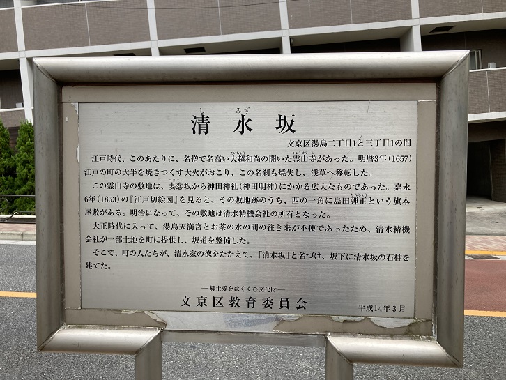 江戸時代、このあたりに、名僧で名高い大超和尚の開いた霊山寺があった。明暦三年(1657年)江戸の町の大半を焼きつくす大火がおこり、この名刹も焼失し、浅草へ移転した。この霊山寺の敷地は、妻恋坂から神田神社(神田明神)にかかる広大なものであった。嘉永六年(1853年)の「江戸切絵図」を見ると、その敷地跡のうち、西の一角に島田弾正という旗本屋敷がある。明治になって、その敷地は清水精機会社の所有となった。大正時代に入って、湯島天満宮とお茶の水の間の往き来が不便であったため、清水精機会社が一部土地を町に提供し、坂道を整備した。そこで、町の人たちが、 清水家の徳をたたえて、「清水坂」と名づけ、坂下に清水坂の石柱を建てた。