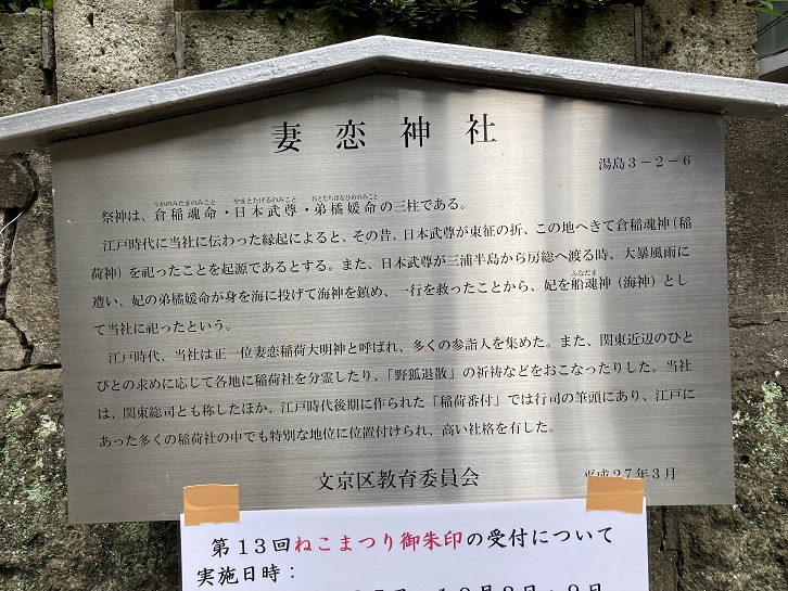 江戸時代に当社に伝わった縁起によると、その昔、日本武尊が東征の折、この地へきて倉稲魂神(稲荷神)を祀ったことを起源であるとする。また、日本武尊が三浦半島から房総へ渡る時、大暴風雨に遭い、妃の弟橘媛命が身を海に投げて海神を鎮め、一行を救ったことから、妃を船魂神(海神)として当社に祀ったという。江戸時代、当社は正一位妻恋稲荷大明神と呼ばれ、多くの参詣人を集めた。また、関東近辺のひとびとの求めに応じて各地に稲荷社を分霊したり、「野狐退散」の祈祷などをおこなったりした。当社は、関東総司とも称したほか、江戸時代後期に作られた「稲荷番付」では行司の筆頭にあり、江戸にあった多くの稲荷社の中でも特別な地位に位置付けられ、高い社格を有した。