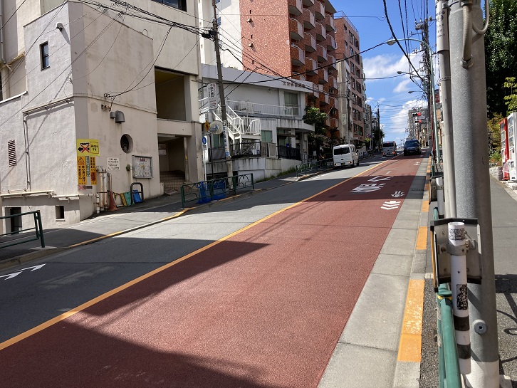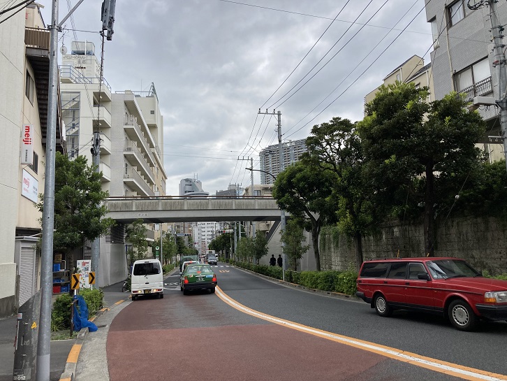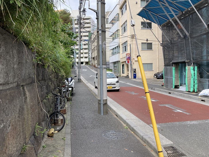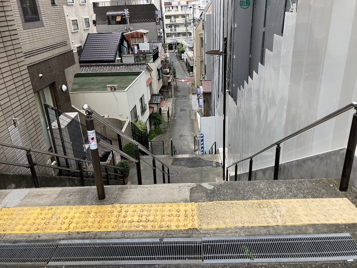 道路の東側は切り立った崖になっていて、周辺には多くの坂や階段があります。実盛坂(さねもりざか)は別名を貝坂といい、長さ約20mほどの急階段です。階段上から見下ろすと足がすくむような非常に急な傾斜になっています。実盛塚・首洗いの井戸・産湯の井戸などが坂下にあったという斎藤実盛(長井別当とも呼ばれます)にまつわる伝説があり、それに基づいて実盛坂という坂名になりました。