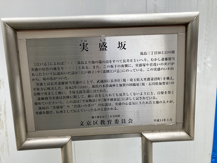 「江戸志」によれば「・・・湯島より池の端の辺をすべて長井庄といへり、むかし斎藤別当実盛の居住の地なり・・・」とある。また、この坂下の南側に、実盛塚や首洗いの井戸があったという伝説めいた話が「江戸砂子」や「改撰江戸志」にのっている。この実盛のいわれから、坂の名がついた。実盛とは長井斎藤別当実盛のことで、武蔵国に長井庄(現・埼玉県大里郡妻沼町)を構え、平家方に味方した。寿永二年(1183年)源氏の木曽義仲と加賀の国篠原(現・石川県加賀市)の合戦で勇ましく戦い、手塚太郎光盛に討たれた。斎藤別当実盛は出陣に際して、敵に首をとられても見苦しくないようにと、白髪を黒く染めていたという。この話は「平家物語」や「源平盛衰記」に詳しく記されている。湯島の“実盛塚”や“首洗いの井戸”の伝説は、 実盛の心意気にうたれた土地の人々が、実盛を偲び、伝承として伝えていったものと思われる。