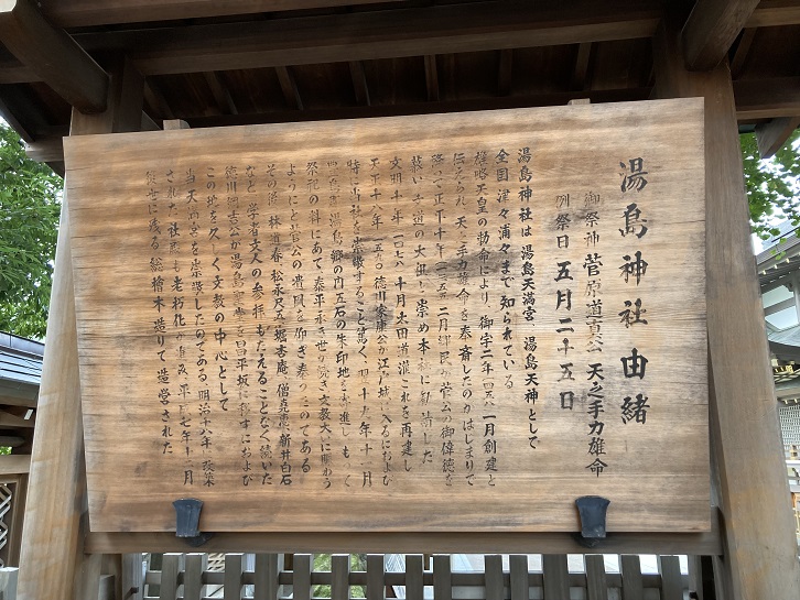 社殿は平成七年(1995年)総檜木造りとして造営された。平成五年(1993年)お木曳き(造営の開始)の神事が行われ、遷座祭(完成)まで2年7か月を要した。祭神は菅原道真である。伝承によれば文和四年・正平十年(1355年)湯島の郷民が霊夢によって老松の下に勧請したといわれている。その後、太田道灌が社殿を再興し、江戸時代になって、徳川家康はじめ歴代の将軍があつく庇護し隆盛をきわめた。かって、湯島天満宮は”湯島天神”として知られ、鳥居前には門前町もでき、多くの人々で賑わった。