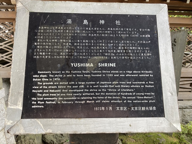 Commonly known as the Yushima Tenjin, Yushima Shrine stands on a ridge above Kiridoshi-zaka slope. The shrine is said to have been founded in 1355 and was afterward restored by Dokan Ohta in 1478. The grounds are dotted with a large number of Japanese plum trees and commands a fine view of the streets below the east cliff. It is well known that such literary scholars as Doshun Hayashi and Hakuseki Arai worshipped the shrine as the "Shrine of Literature". The plum trees at one time nearly withered, but the donation of hundreds of young trees by the local community has succeeded in retaining the fame of the shrine. The annual “Ume-Matsuri", the Plum Festival, in February through March still claims attention of the nation-wide plum admirers.
