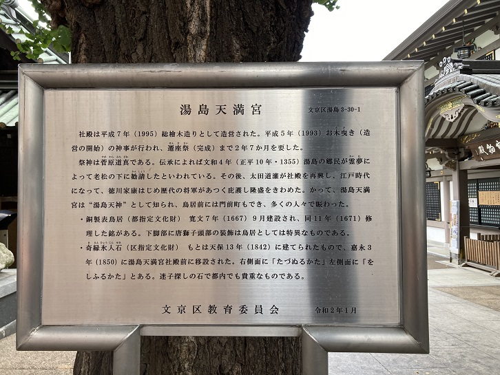 湯島天満宮は東京の代表的な天満宮であり、学問の神様として知られる菅原道真公を祀っています。受験シーズンには多数の受験生が合格祈願に訪れますが、普段も学問成就を願う人や修学旅行の生徒達で賑わっています。境内の梅の花も有名で、この地の梅を歌った藤原亮子・小畑実による湯島の白梅は戦中時の歌として大ヒットしました。歌のタイトルのように、境内の約300本の梅の木のうち約8割は白梅となっています。鳥居の脇に由緒書きが掲示されています。