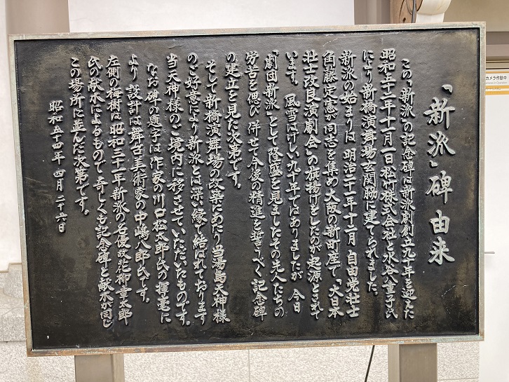 この「新派」の記念碑は新派劇創立九十年を迎えた昭和五十二年十一月一日松竹株式会社と水谷八重子氏により新橋演舞場玄関脇に建てられました。新派の始まりは明治二十一年十二月自由党壮士角藤定憲が同志を集め大阪の新町屋で「大日本壮士改良演劇会」の旗揚げをしたのが起源とされています。風雪はげしい九十年ではありましたが 今日「劇団新派」として隆盛を見ましたその先人たちの労苦を偲び併せて今後の精進を誓うべく記念碑の建立を見た次第です。そして新橋演舞場の改装にあたり当湯島天神様のご好意により新派とは深い縁で結ばれております当天神様のご境内に移させていただいたものです。なお碑の題字は作家の川口松太郎氏の揮毫により設計は舞台美術家の中嶋八郎氏です。左側の梅樹は昭和三十一年新派の名優故花柳章太郎氏の献木によるもので奇しくも記念碑と献木が同じこの場所に並んだ次第です。