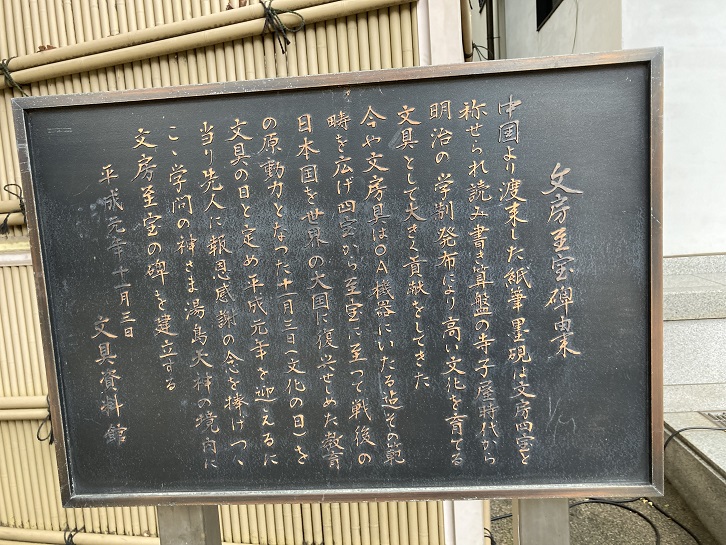 中国より渡来した紙筆墨硯は文房四宝と称せられ、読み書き算盤の寺子屋時代から明治の学制発布により高い文化を育てる文具として大きく貢献をしてきた。今や文房具はOA器機にいたる迄その範疇を広げ、四宝から至宝に至って戦後の日本国を世界の大国に復興せしめた教育の原動力となった。十一月三日(文化の日)を文具の日として定め、平成元年を迎えるに当たり、先人に報恩感謝の念を捧げつゝこゝ、学問の神さま湯島天神の境内に文具至宝の碑を建立する。