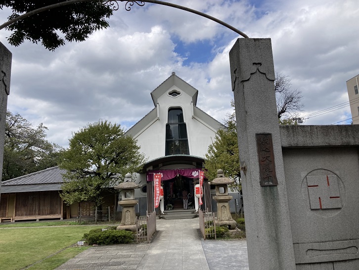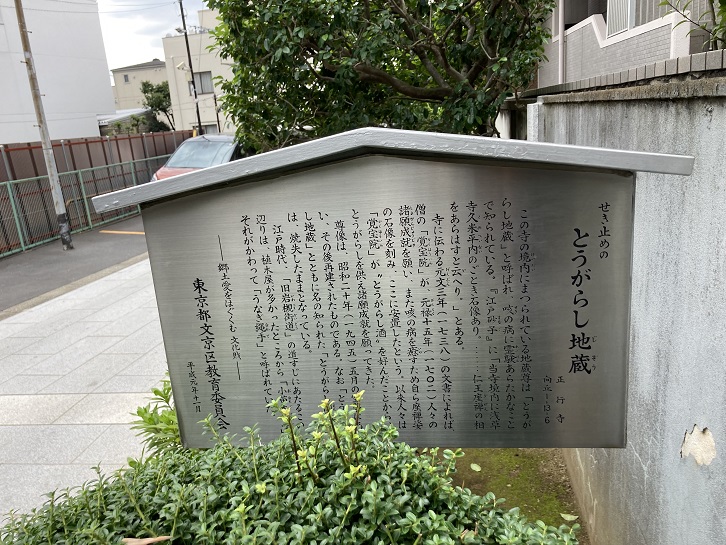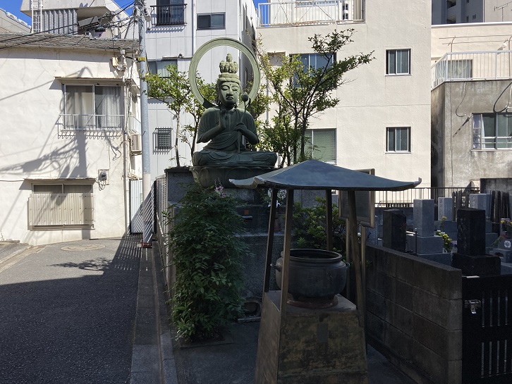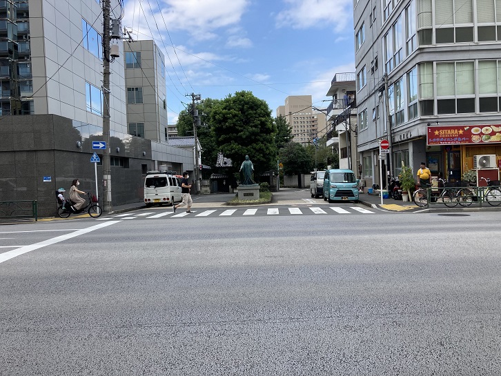 春日通りに面した麟祥院の参道の入口には春日局の像が建っています。麟祥院は春日局の菩提寺です。