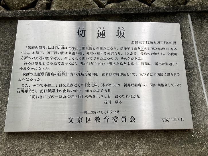 「御府内備考」には「切通は天神社と根生院との間の坂なり、是後年往来を開きし所なればいふなるべし。本郷三・四丁目の間より池の端、仲町へ達する便道なり、」とある。湯島の台地から、御徒町方面への交通の便を考え、新しく切り開いてできた坂なので、その名がある。初めは急な石ころ道であったが、明治三十七年(1904年)上野広小路と本郷三丁目間に、電車が開通してゆるやかになった。映画の主題歌「湯島の白梅」"青い瓦斯灯境内を出れば本郷切通し"で、坂の名は全国的に知られるようになった。また、かって本郷三丁目交差点近くの「喜之床」(本郷2−38−9・新井理髪店)の二階に間借りしていた石川啄木が、朝日新聞社の夜勤の帰り、通った坂である。