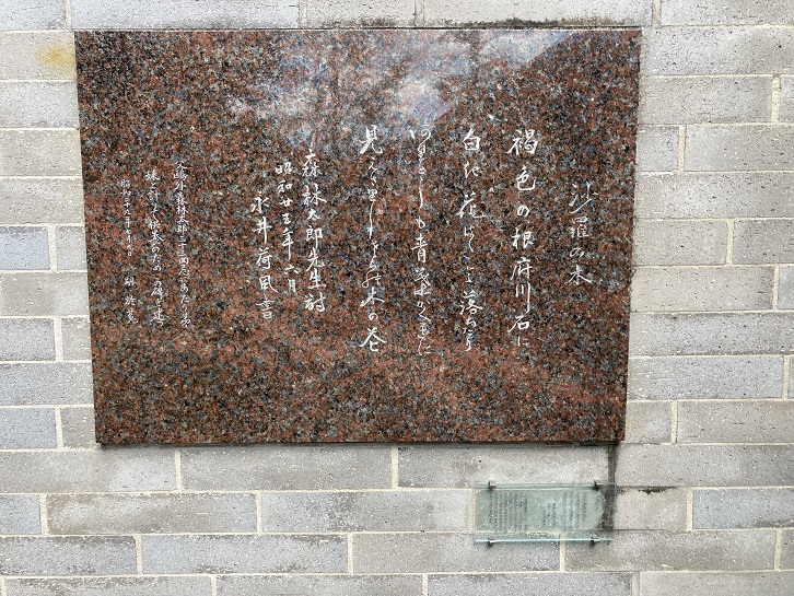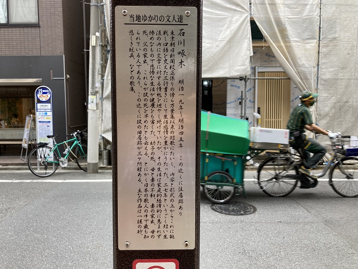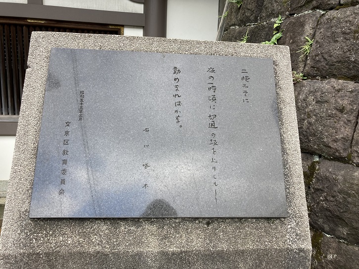 切通坂の中程に石川啄木の歌碑と当時の苦しかった生活ぶりを記した石碑が置かれています。