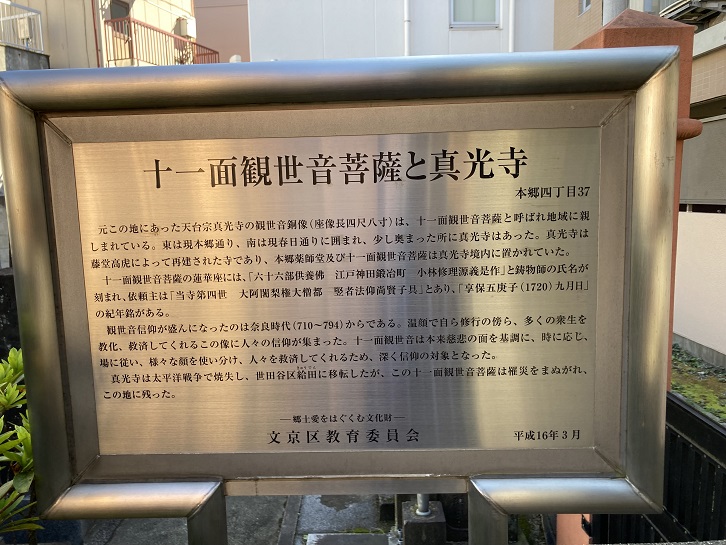 この地にあった天台宗真光寺の観世音銅像(座像長四尺八寸)は、十一面観世音菩薩と呼ばれ地域に親しまれている。東は現本郷通り、南は現春日通りに囲まれ、少し奥まった所に真光寺はあった。真光寺は藤堂高虎によって再建された寺であり、本郷薬師堂及び十一面観世音菩薩は真光寺境内に置かれていた。十一面観世音菩薩の蓮華座には、「六十六部供養佛 江戸神田鍛冶町 小林修理源義是作」と鋳物師の氏名が刻まれ、依頼主は「当寺第四世 大阿闍梨権大僧都 竪者法仰尚賢子具」とあり、「享保五庚子(1720年)九月日」の紀年銘がある。観世音信仰が盛んになったのは奈良時代(710年〜794年)からである。温顔で自ら修行の傍ら、多くの衆生を教化、救済してくれるこの像に人々の信仰が集まった。十一面観世音は本来慈悲の面を基調に、時に応じ、場に従い、様々な顔を使い分け、人々を救済してくれるため、深く信仰の対象となった。真光寺は太平洋戦争で焼失し、世田谷区給田に移転したが、この十一面観世音菩薩は罹災をまぬがれ、この地に残った。