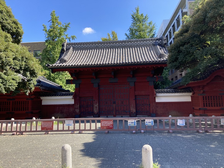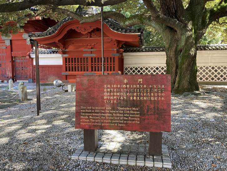 文政十年(西暦1827年)加賀藩主前田斉泰にとついだ第十一代将軍徳川家斉の息女溶姫のために建てられた朱塗りの御守殿門であり、重要文化財に指定されています。