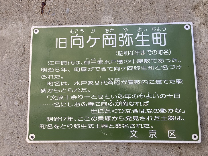 江戸時代は、御三家水戸藩の中屋敷であった。明治五年、町屋ができて向ヶ岡弥生町と名づけられた。町名は、水戸家九代斉昭が屋敷内に建てた歌碑からとられた。