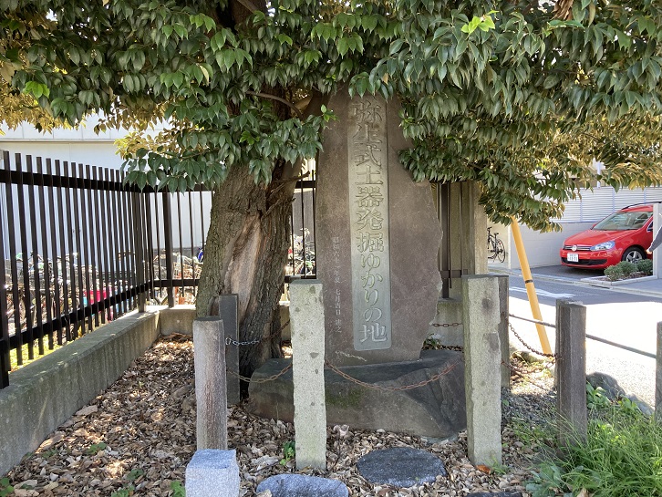 交差点の角には見所ポイントAの「弥生式土器発掘ゆかりの地」と書かれた立派な石碑も建っています。「弥生式土器」って、社会科の教科書で見たことがあるような気がしますね。