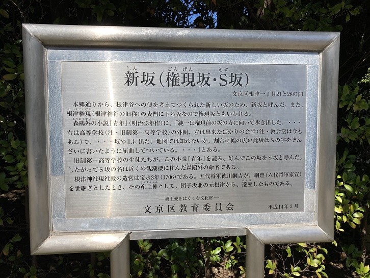 根津神社の正門の大鳥居前から東大球場裏にかけて、”S”字状に曲がって急坂が上がっています。坂道の形がS字状であるために、森鴎外が命名して旧一高生たちがこの名で呼んだのが坂名の由来になっています。別名を権現坂または新坂といいます。権現坂は根津権現に因むものと思われます。坂下の大鳥居脇に案内板が立っています。