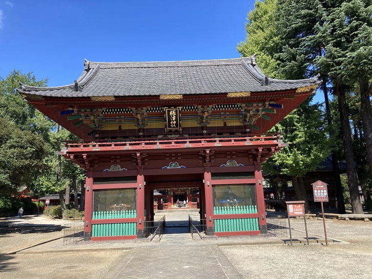 見所ポイントBの「根津神社」は根津権現とも称され、元准勅祭社(東京十社)のひとつになっています。楼門は三間一戸・入母屋造・桟瓦葺で、唐門の手前に位置しています。唐門や本殿などと同じ宝永三年(1706年)の建造です。楼門(随身門ともいいます)は、貴族の警護のために随従した近衛府の官人である随身像を左右に安置した神社の門のことを指します。根津神社の楼門の右側の青い服を着た随身像は、水戸黄門こと水戸光圀がモデルといわれています。
