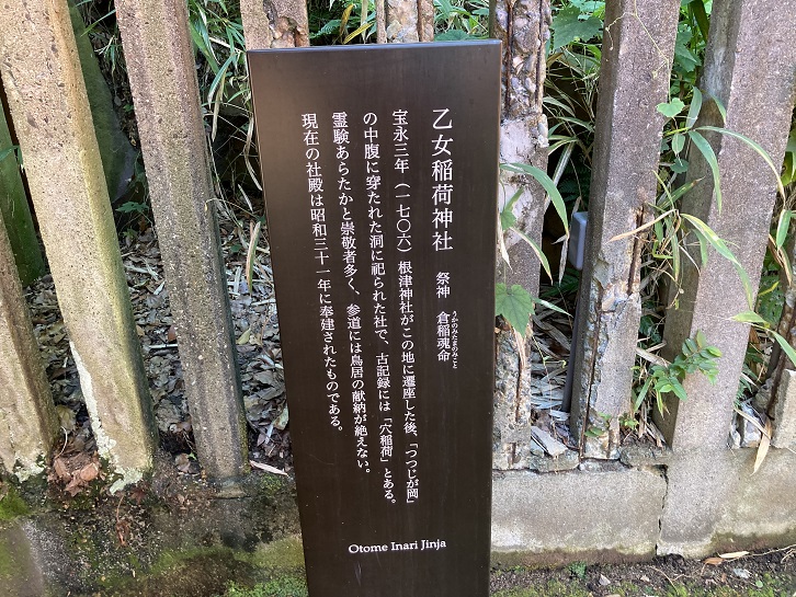 宝永三年(1706年)根津神社がこの地に遷座した後、「つつじが岡」の中腹に穿たれた洞に祀られた社で、古記録には「穴稲荷」とある。霊験あらたかと崇敬者多く、参道には鳥居の献納が絶えない。現在の社殿は昭和三十一年に奉建されたものである。