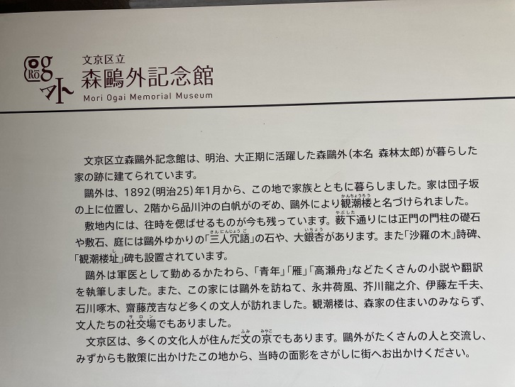 記念館は明治の文豪森鴎外が、後半生を過ごした旧居跡(都指定旧跡)に建てられました。2階からはるかに東京湾が望めたとされ、鴎外自ら「観潮楼(かんちょうろう)」と命名しました。館内では、鴎外の自筆原稿、書簡などの展示をはじめ、文京区ゆかりの文人たちを紹介しています。