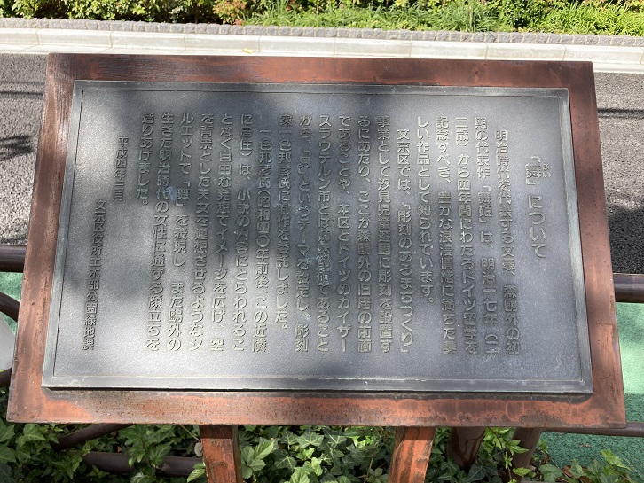 これは有名な新派「婦系図」(原作・泉鏡花)の湯島天神の場である。この境内には、もとガス灯が五基あったが、そのうち形だけ残っていた男坂上の最後の一基は、昭和四十年頃撤去された。ガス街灯は、明治五年(1872年)開港地横浜に点灯されたのが最初で、東京には、同七年金杉橋・京橋間に八十五基が設置された。ガス灯は、文明開化のシンボルで、明治の時代を象徴するものであった。今、ここに、東京ガス株式会社の協力を得て、ガス灯を設け点灯することになったが、これは都内で、屋外のものとしては、唯一つのものである。