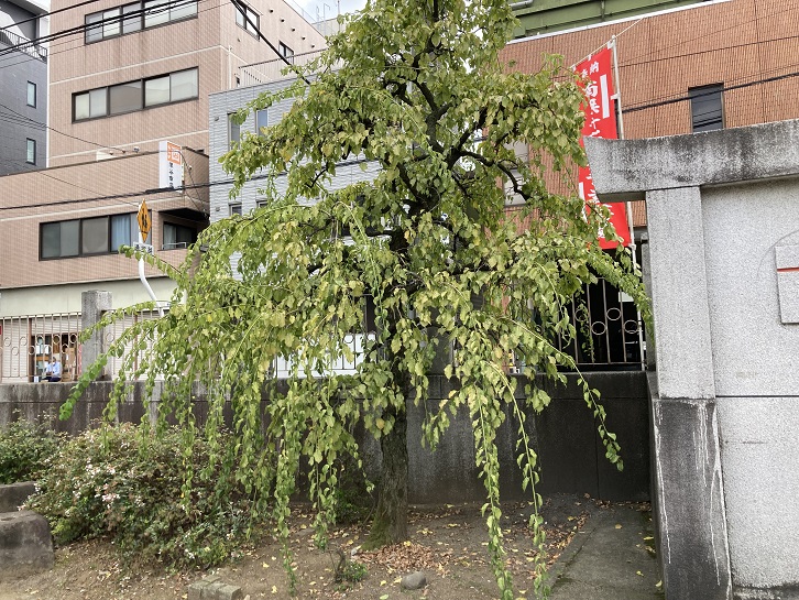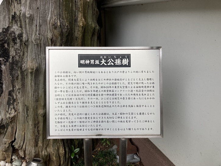 この公孫樹は、向い側の男坂解説にもあるとおり江戸の昔よりこの地に育ちました由緒ある樹木です。大正時代、関東大震災により社殿をはじめ神社の諸施設がことごとく炎上し崩壊したなか、その焼け跡に唯一残されたのがこの公孫樹でした。震災で焼け残った公孫樹からひこばえが生え育ち、その後、昭和二十年の東京大空襲による油脂焼夷弾が東京一帯を襲いましたが、昭和九年建立の鉄骨鉄筋コンクリート造・総漆塗の社殿は当時としては日本初の耐火耐震構造を持つ神社建築であったため焼失を免れました(国登録文化財・文化庁)。その一方、ひこばえは被災の憂き目にあったにもかかわらず立派な樹木となり親木を支えることとなりました。この度、親木のほうは枯木につき倒木危険防止のため上部を伐採し保存することといたしました。江戸時代、月見の名所に植えられた公孫樹は、大正・昭和の災害にも遭遇しながらも子孫を残し、この地の歴史を伝えてきた大切なご神木と言えます。災難除け・厄除け・縁結びのご神徳を持ち長い間この地を見守ってきたご神木として、今後とも後世にお伝えいたします。ひこばえの生育が後世までも受け継がれてゆくことを心より願うものであります。