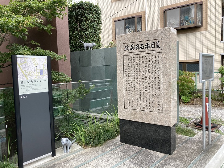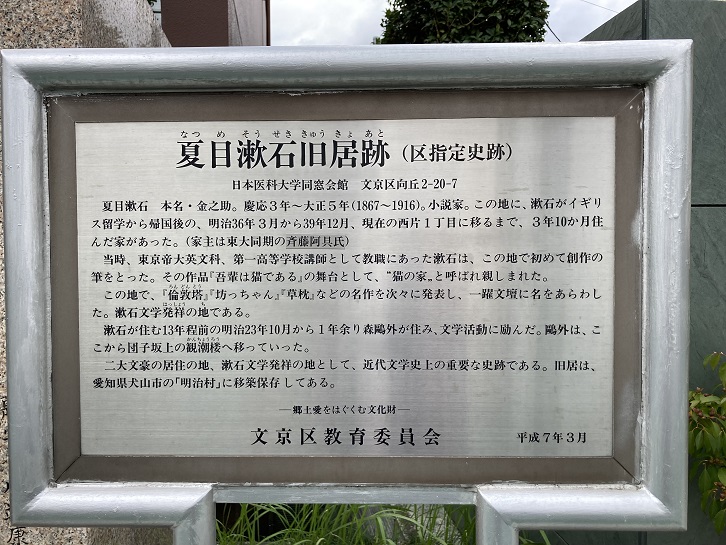 文豪夏目漱石(1867年〜1916年)の旧居跡。漱石は、イギリスから帰国後の1903年から3年間ここに住んでいました。この間、東京大学英文科・第一高等学校の講師として活躍する一方、この旧居を作品の舞台として処女作、「吾輩は猫である」を執筆しました。