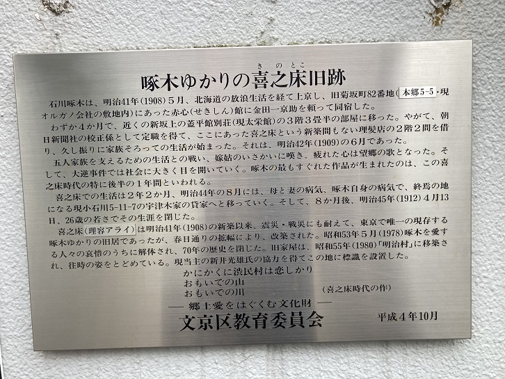 この歌は、石川啄木(1886年〜1912年)の明治四十三年(1910年)の作で、「悲しき玩具」に収められている。文字は、原稿ノートの自筆を刻んだ。当時啄木は、旧弓町の喜之床(現本郷二ノ三八ノ九・新井理髪店)の二階に間借りしていた。そして、一家五人を養うため、朝日新聞社に校正係として勤務し、二晩おきに夜勤もした。夜勤の晩には、終電車で上野の広小路まで来たが、本郷三丁目行きの電車はもう終わっている。湯島神社の石垣をまさぐりながら、暗い切通坂を、いろいろな思いを抱いて上ったことであろう。喜之床での二年二か月の特に後半は、啄木文学が最高に燃焼した時代である。この歌は、当時の啄木の切実な生活の実感を伝えている。文京区内で、最後に残っていた啄木ゆかりの家”喜之床”が、この(昭和五十五年)三月十八日に、犬山市の博物館「明治村」に移築、公開された。