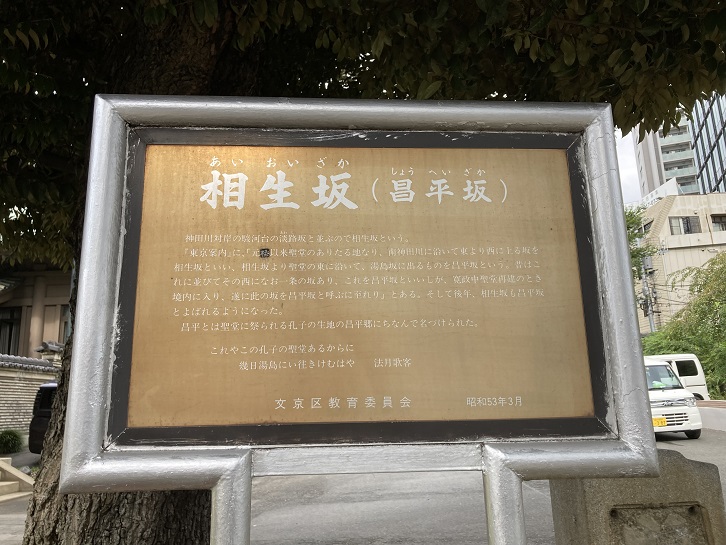 三十八段の石段坂である。別名は天神男坂。すぐわきにある、ゆるやかな坂・女坂に対して男坂という。江戸時代の書物”御府内備考”によると、湯島神社(天神)参拝のための坂であったが、その後、本郷から上野広小路に抜ける通り道になったという。