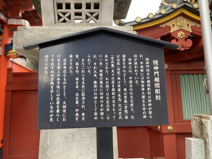 随神門四方の欄間彫刻は四神が彫られ、中央部には御祭神大國主之命の神話が描かれている。四神とは、中国古代の天文学上、北極星を中心として、東は青龍(蒼龍)西は白虎(白虎)南は朱雀(朱鳥)北は玄武(玄武亀)夫々の星を禽獣の名をもって表わされた。わが国では大宝元年(701年)朝儀の儀仗に四神の矛が飾られ、それ以来、魔除けの神として崇められている。またこれらを五色に配当され、東を青、西を白、南を赤、北を黒、中央を黄とされた。近年身近なものとして、大相撲における土俵上の各方位には色房を垂らしてそれぞれの方角を示しているのが見受けられる。