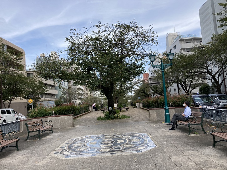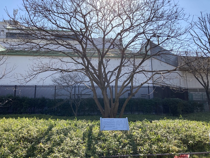 富坂に面した見所ポイントDの「礫川公園」は手入れの行き届いた綺麗な公園で、人工の滝も造られています。今回は公園の中には入りませんでしたが、前回(2021年02月06日)訪れた時はこんな感じでした(季節は真逆ですが)。一本の木の前に案内板が立っています。案内板には、幸田露伴の孫で幸田文の一人娘である青木玉さんの寄稿文が添えられています。