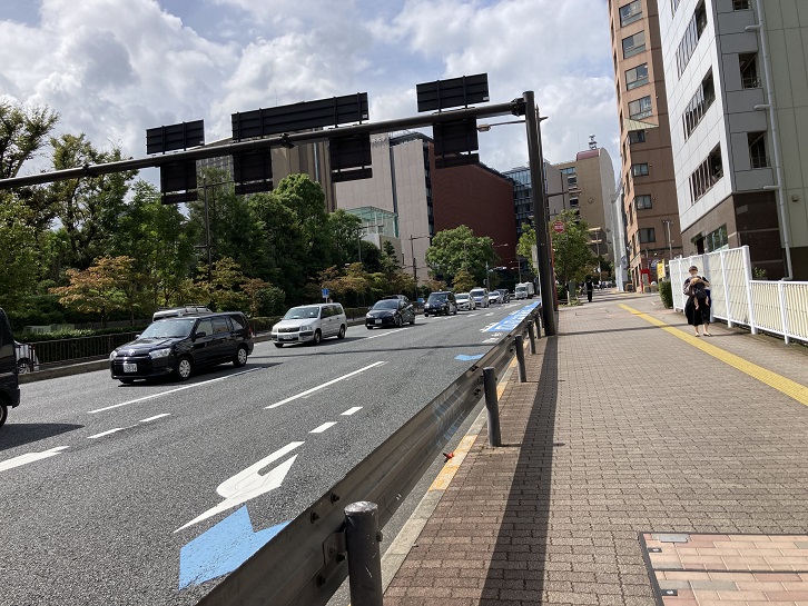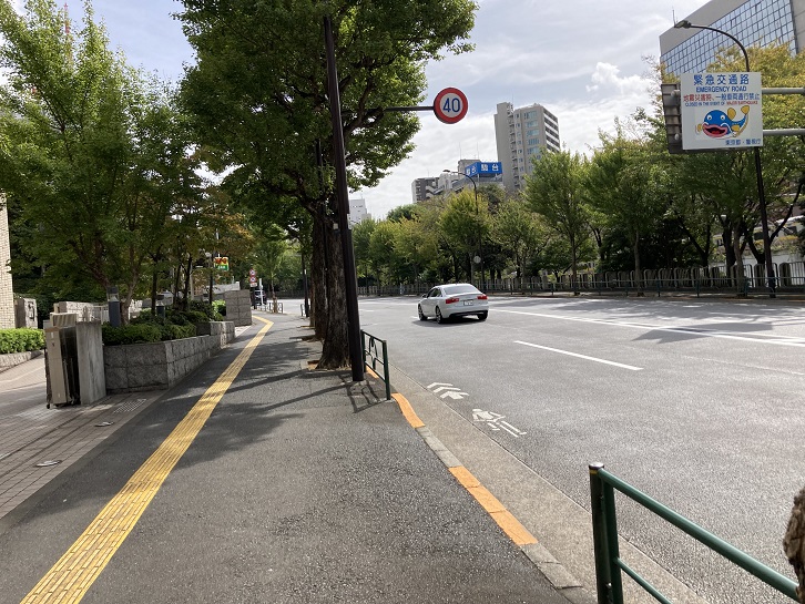 新壱岐坂と交差する地点で右折して新壱岐坂を下ります。壱岐坂下交差点で白山通りに入ります。交差点を右折して北に向かいますと、地下鉄丸ノ内線の高架の先に見所ポイントBの「講道館(柔道資料館・図書館)」の建物が聳えています。