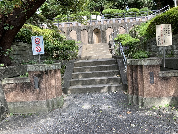 坂の途中に「元町公園」があり、階段を上った奥の壁に何かの構造物の跡のようなものが見えます。ひょっとして、神田上水の大樋(水道橋)が懸けられていた跡なのでしょうか?ちなみに、公園名の「元町」はこの周辺の旧町名になります。